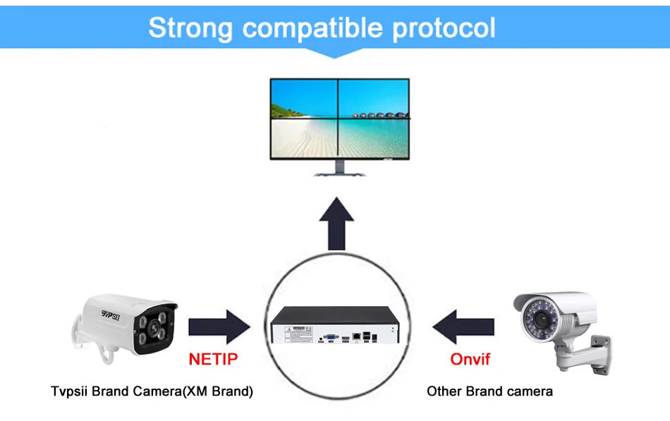 A:This nvr have NETIP protocol (XM:Xmeye and ICsee System ),onvif protocol and so on...,so if your IP camera,wifi camera ,PTZ IP camera is Tvpsii brand ,XM brand and other onvif brand ip camera,it work well.