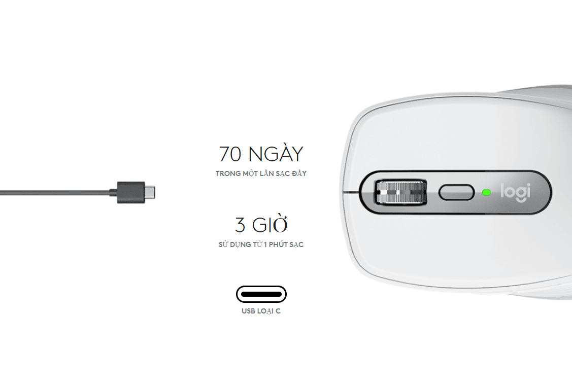 Hỗ trợ sạc nhanh MX Anywhere 3 For Mac hỗ trợ sạc nhanh với USB Type-C với 3 giờ sử dụng sau 1 phút sạc nhanh và có thời lượng pin sử dụng lên đến 70 ngày sau khi sạc đầy. |