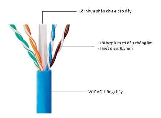 - Dây cáp lõi CCA có đặc điểm là được cấu thành từ 8 lõi CCA.Coper Clad Aluminum được viết tắt thành CCA. Nghĩa là nhôm mạ đồng (bên trong là hợp kim nhôm với bên ngoài mạ đồng). Đường kính của lõi là 0.5mm có độ xoắn đạt chuẩn quốc tế. Lõi chữ thập làm từ nhựa đặc chủng phân tách 4 cặp dây. Giúp chúng không bị chồng chéo cũng như có khả năng chịu lực, giúp cho sợi cáp không bị đè nén. Hay bị chèn ép trong suốt quá trình sử dụng.
