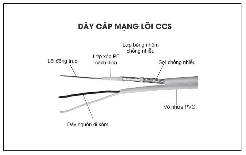 Cáp đồng trục camera có nguồn lõi CCS là lõi thép mạ đồng có khả năng truyền tải tín hiệu. Xung quanh được bao bọc bởi lớp xốp cách điện PE. Có thể chống nhiễu tốt nhờ những sợi kim loại được bện chặt vào nhau. Số sợi kim loại sẽ dao động từ 80 – 128 sợi tùy loại và giá thành. Lớp vỏ nhựa nguyên sinh chống cháy sẽ giúp tín hiệu đường truyền được ổn định. Ngăn chặn tình trạng nhiễu từ xảy ra. Cơ bản là có 4 lớp chính, bao gồm lõi thép mạ đồng, lớp xốp cách điện PE, lớp dầu chống nhiễu và vỏ PVC bên ngoài.